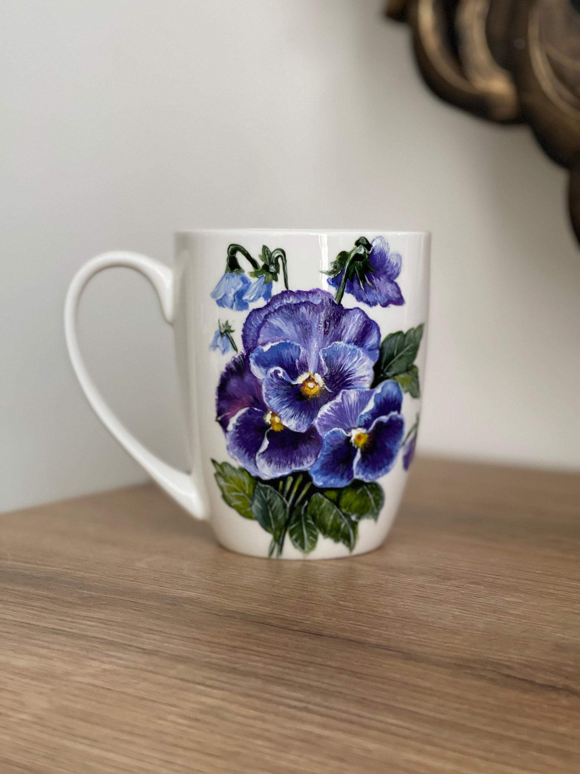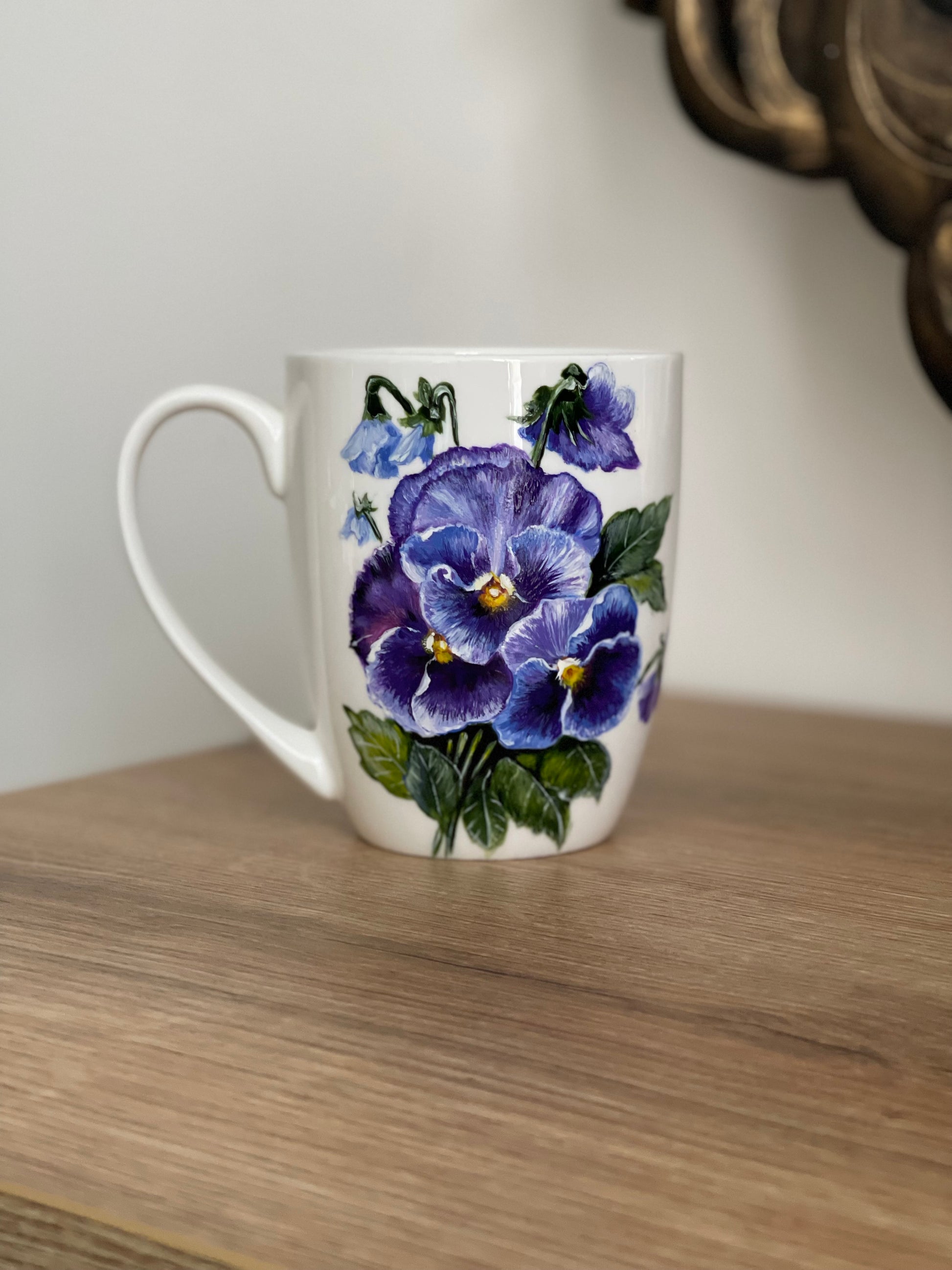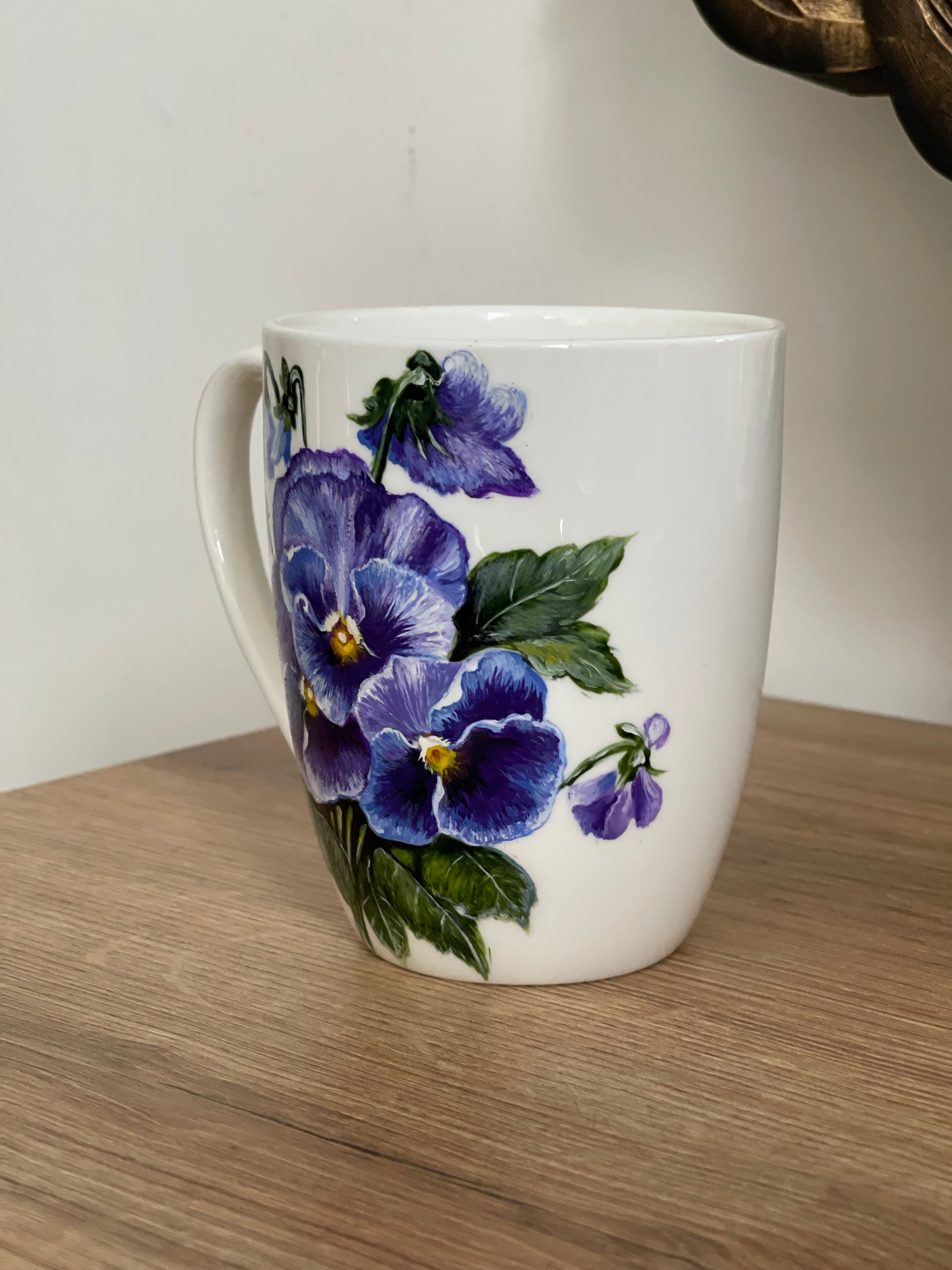 Našlaitės mėlynos simbolizuoja,laisvę,pasitikėjimą,kūrybą – puodelis taps puikia dovana draugei,sesei ar mamai.Nutapytas pagal užsakymą.