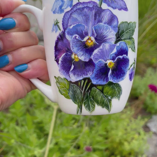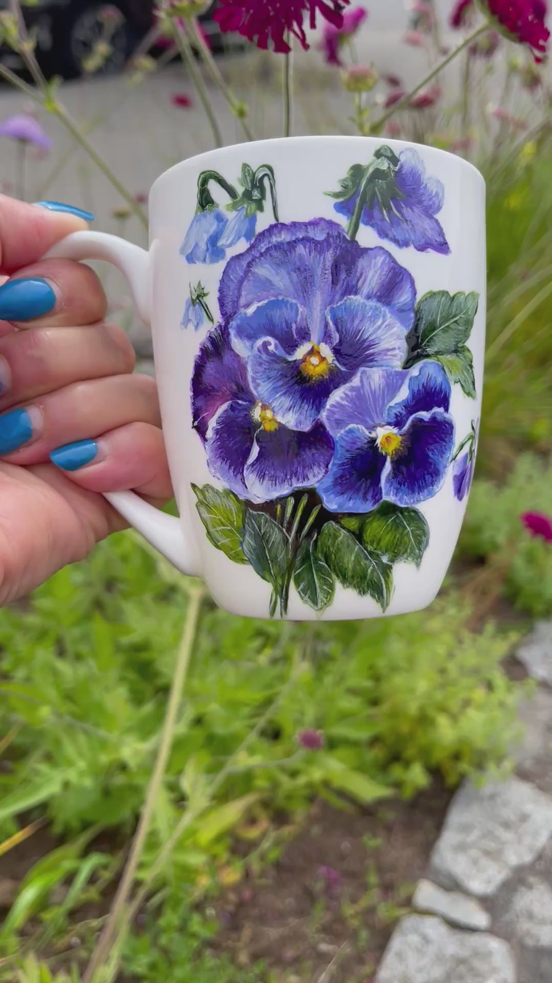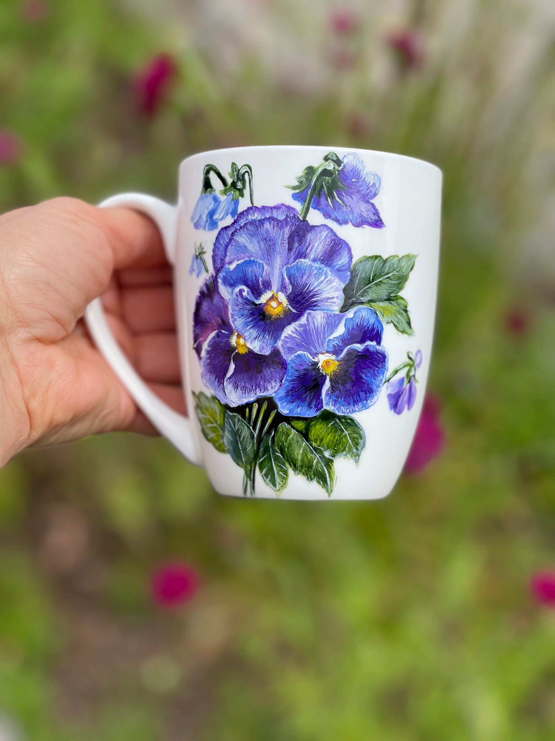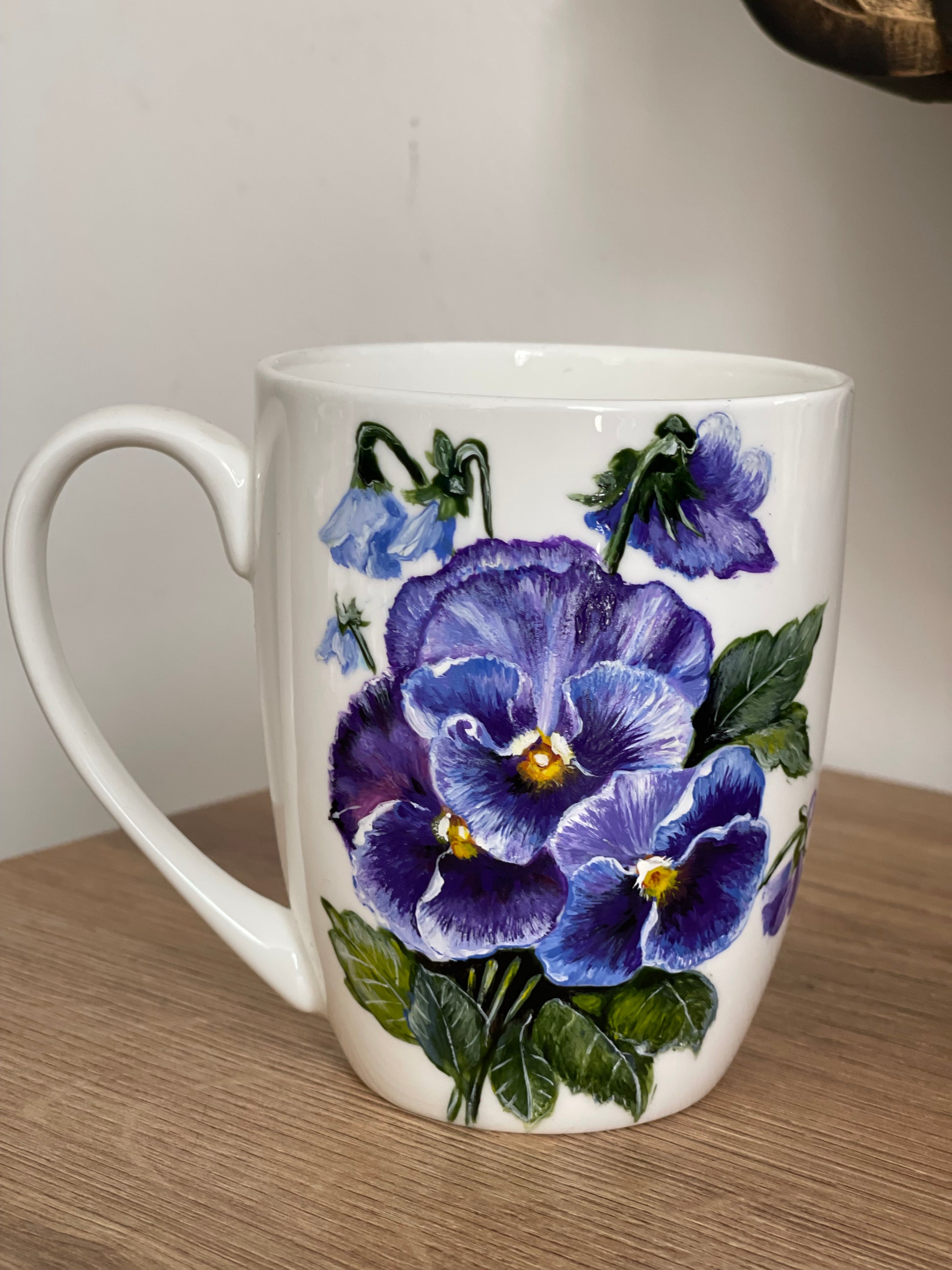 Našlaitės mėlynos simbolizuoja,laisvę,pasitikėjimą,kūrybą – puodelis taps puikia dovana draugei,sesei ar mamai.Nutapytas pagal užsakymą.
