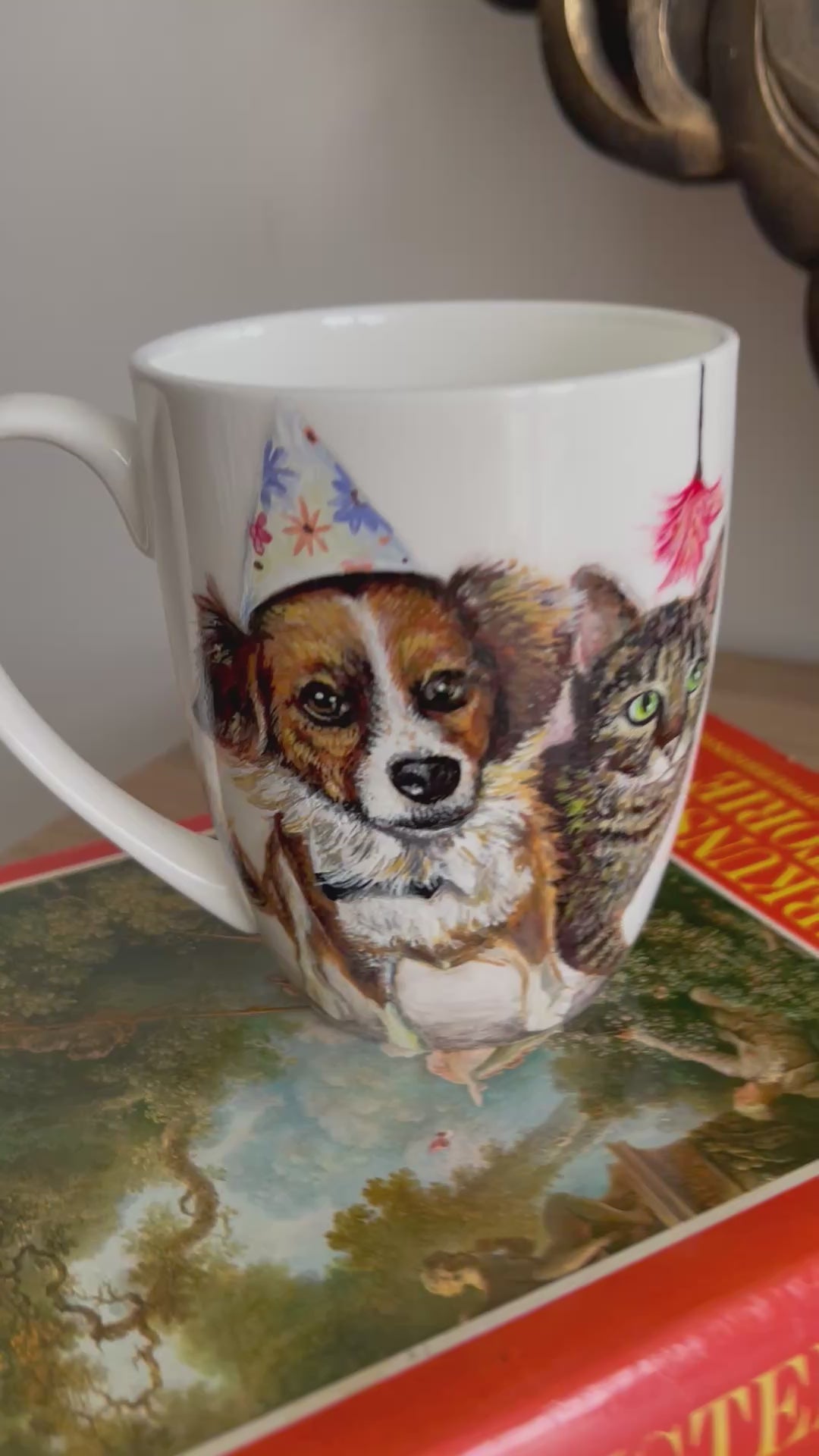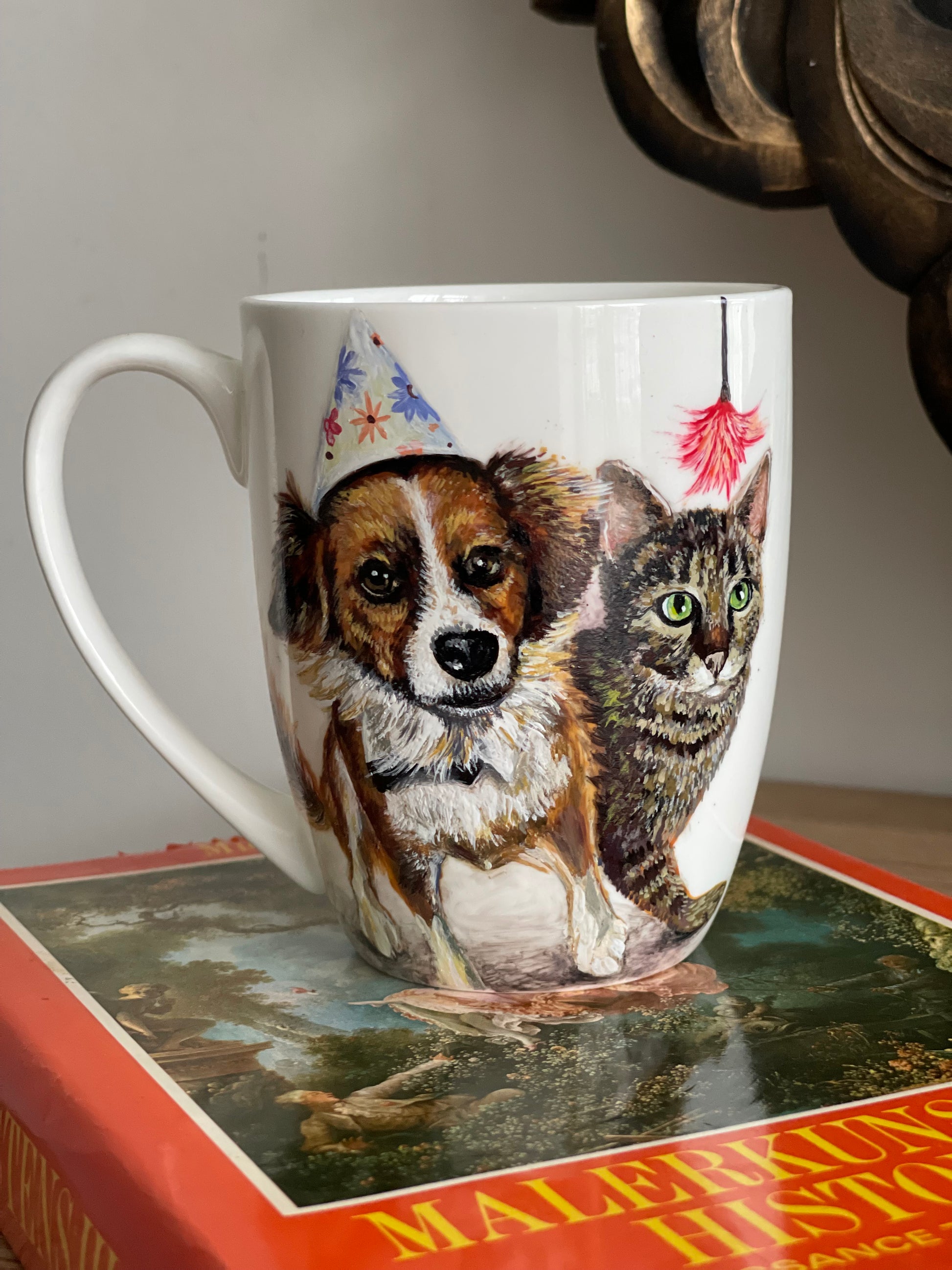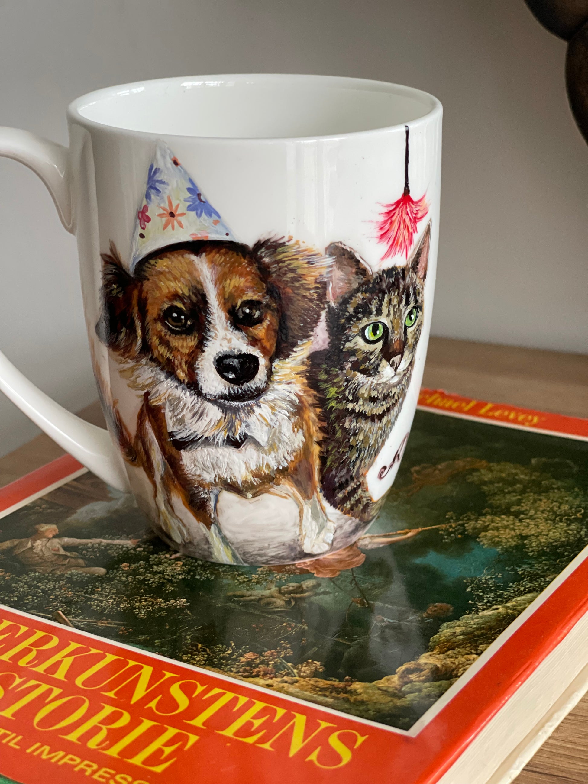 Šis rankų darbo porcelianinis puodelis su nutapytu Šuniuku ir kačiuku sukurtas iš stsiųstos fotonuotraukos,tiems, kurie mėgsta autentiškus, meniškus daiktus ir nori kasdien jausti jaukumo bei grožio prisilietimą. Piešinys tapytas rankomis, todėl kiekvienas puodelis yra vienetinis kūrinys, turintis savo istoriją.