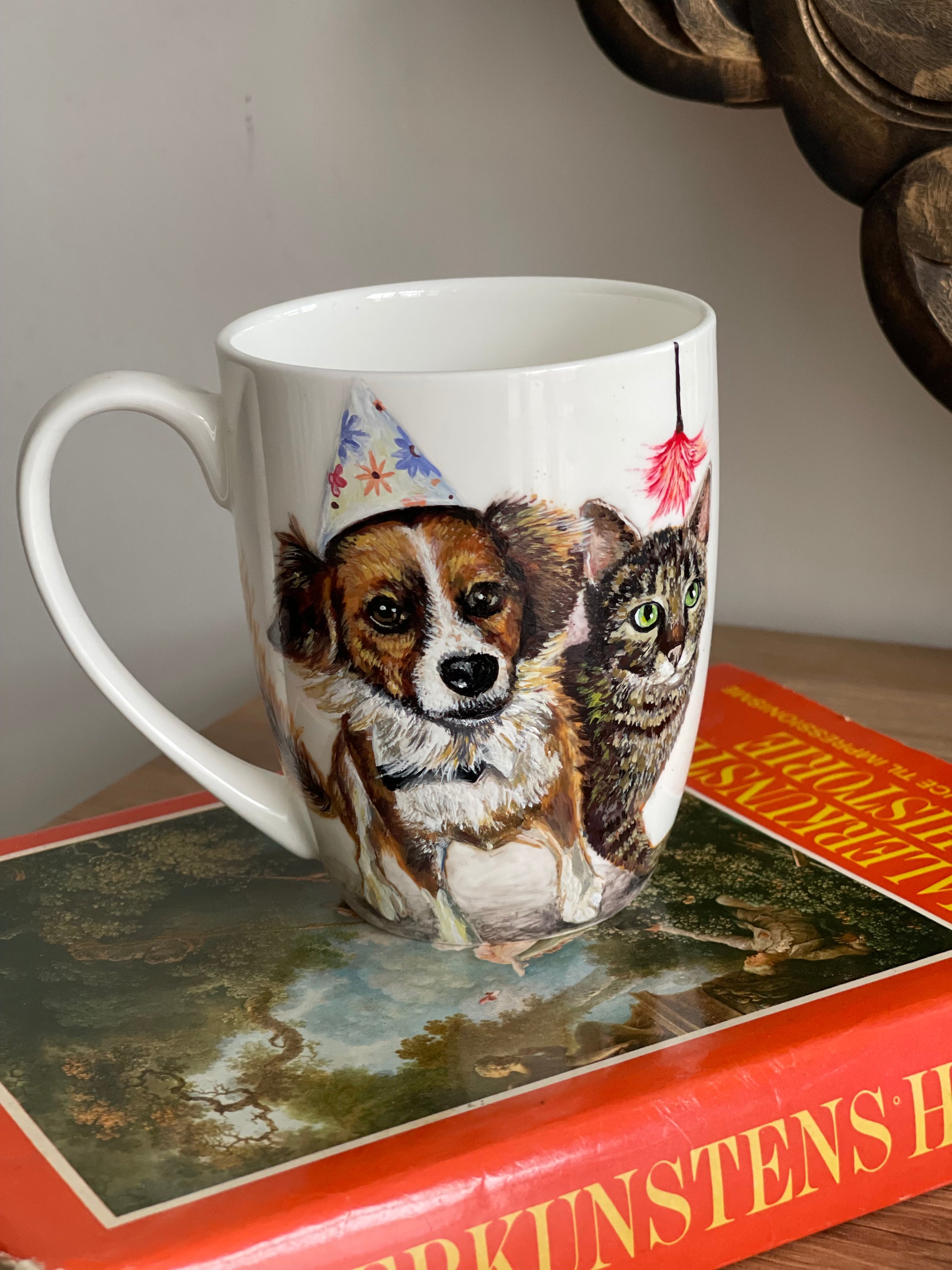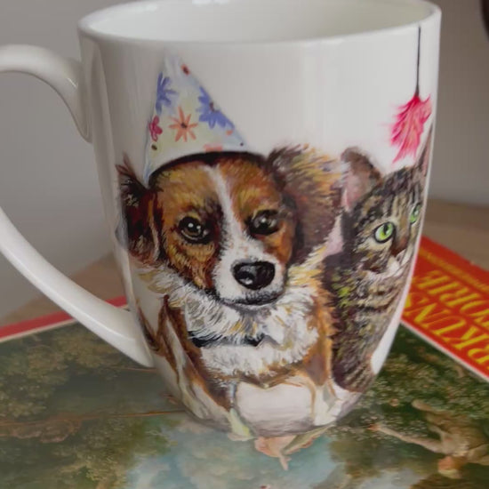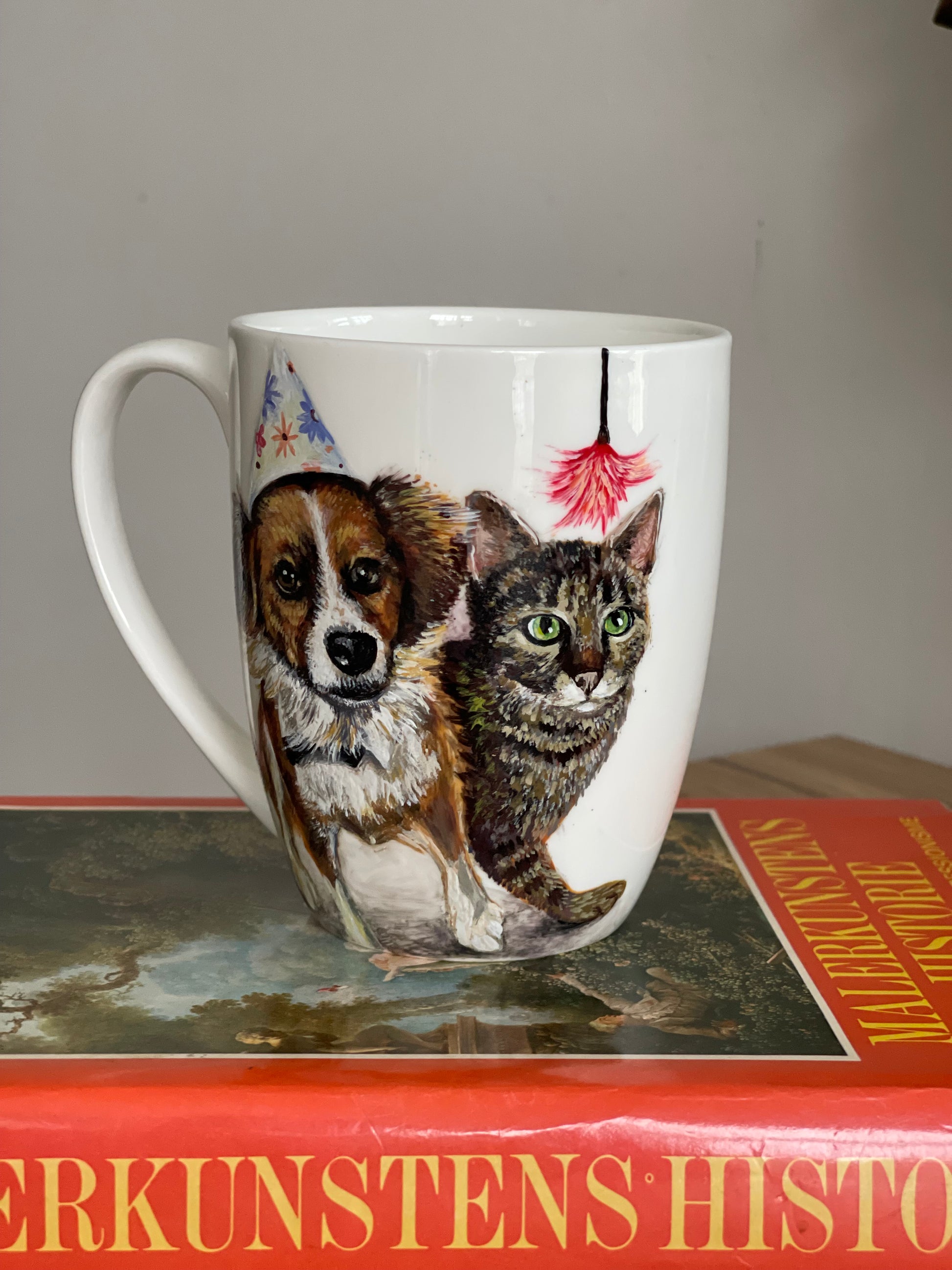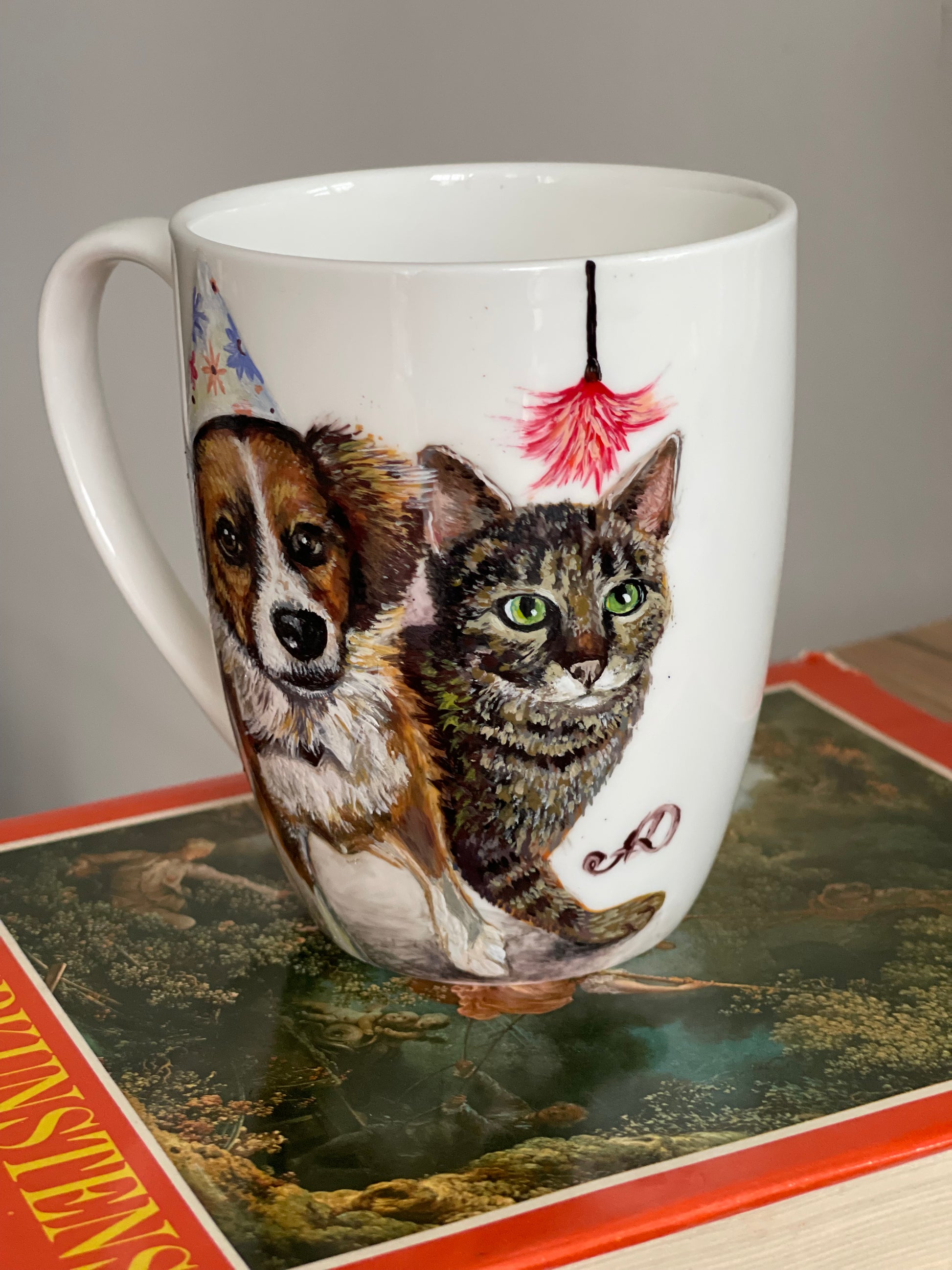 Šis rankų darbo porcelianinis puodelis su nutapytu Šuniuku ir kačiuku sukurtas iš stsiųstos fotonuotraukos,tiems, kurie mėgsta autentiškus, meniškus daiktus ir nori kasdien jausti jaukumo bei grožio prisilietimą. Piešinys tapytas rankomis, todėl kiekvienas puodelis yra vienetinis kūrinys, turintis savo istoriją.
