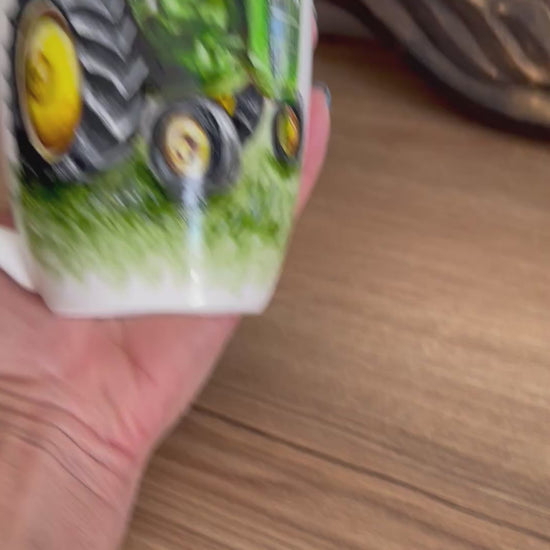 Traktorius nutapytas gimtadienio progai – puodelis taps puikia dovana vaikui tėčiui.