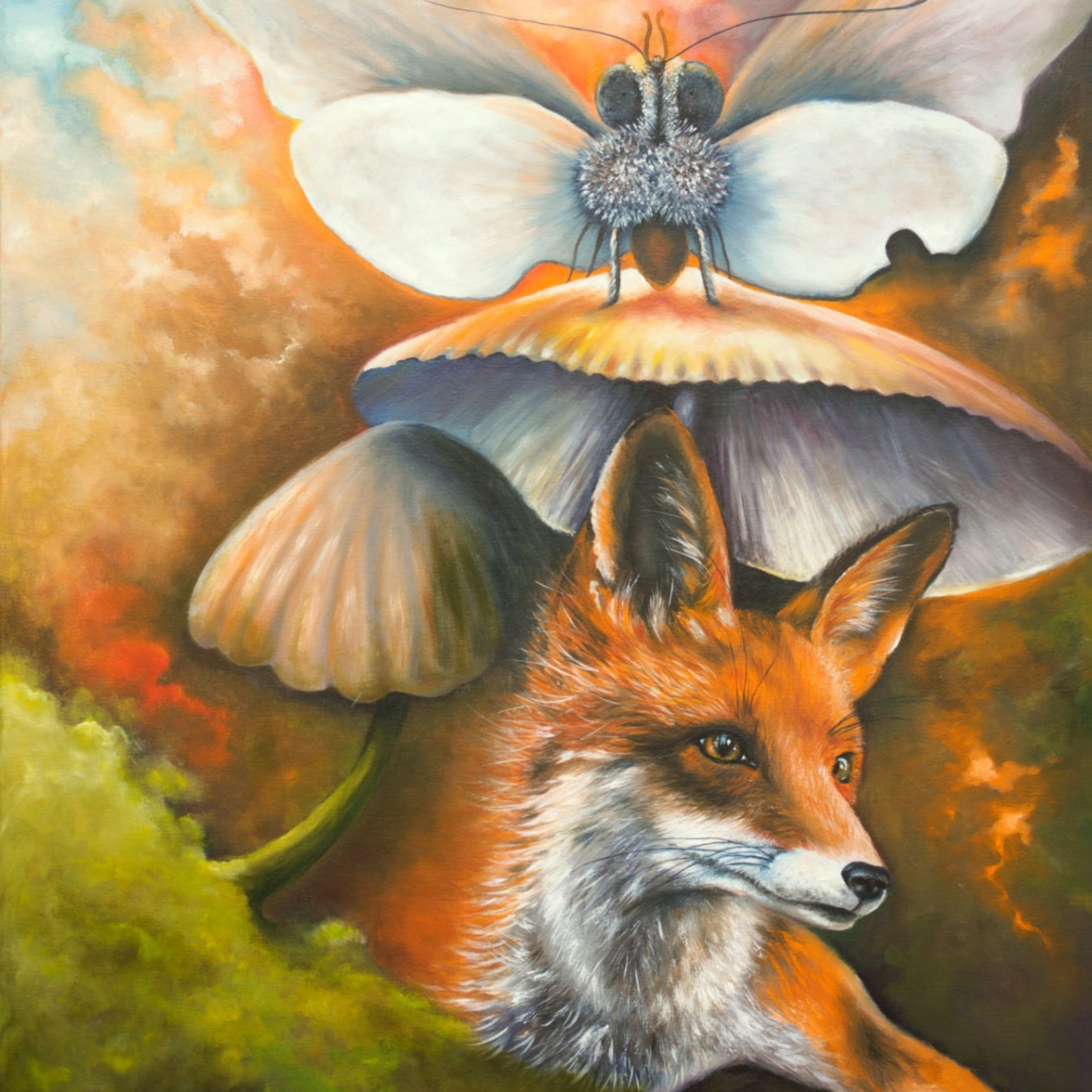 Čia išnyksta ribos tarp praeities ir ateities, o esama akimirka atsiskleidžia ją užfiksavus. Spurdantis drugelis su trapias sparnais, kuriuos lyg šviesa apkloja dabartis, trumpam sustingo šiame momente. Smalsi lapė su savo laukine prigimtimi, nukreipusi skvarbų žvilgsnį į priekį, tarsi tyrinėja nežinomus rytojaus kelius. Virš jų, debesys – tarsi spalvoti atsiminimai – tolsta į praeitį, kad užleistų vietą šiandienos realybei. Šiame paveiksle užfiksuotas amžinas momentas, kuriame susitinka laiko tėkmė, gyvenimo dinamika ir svajonės.